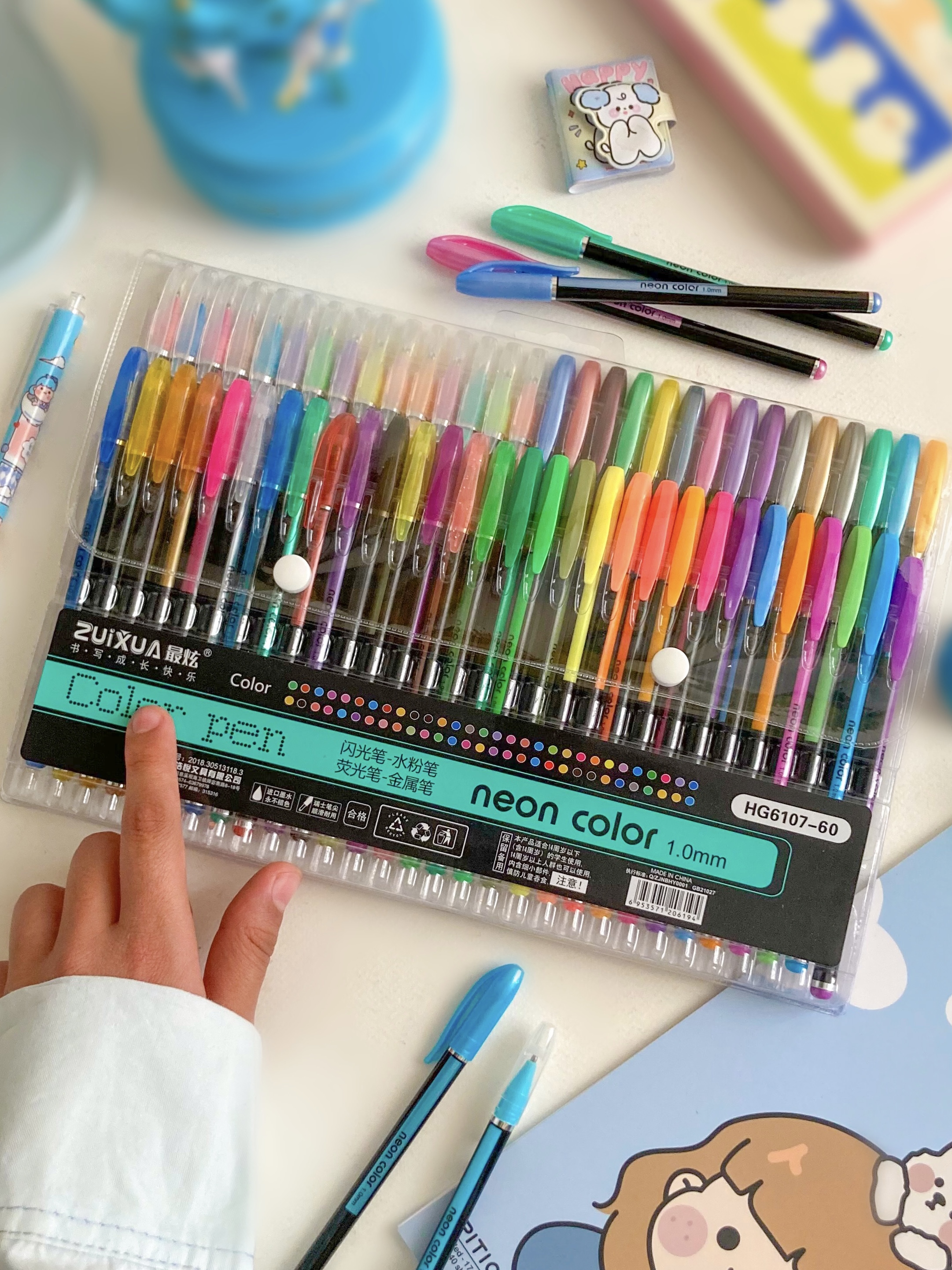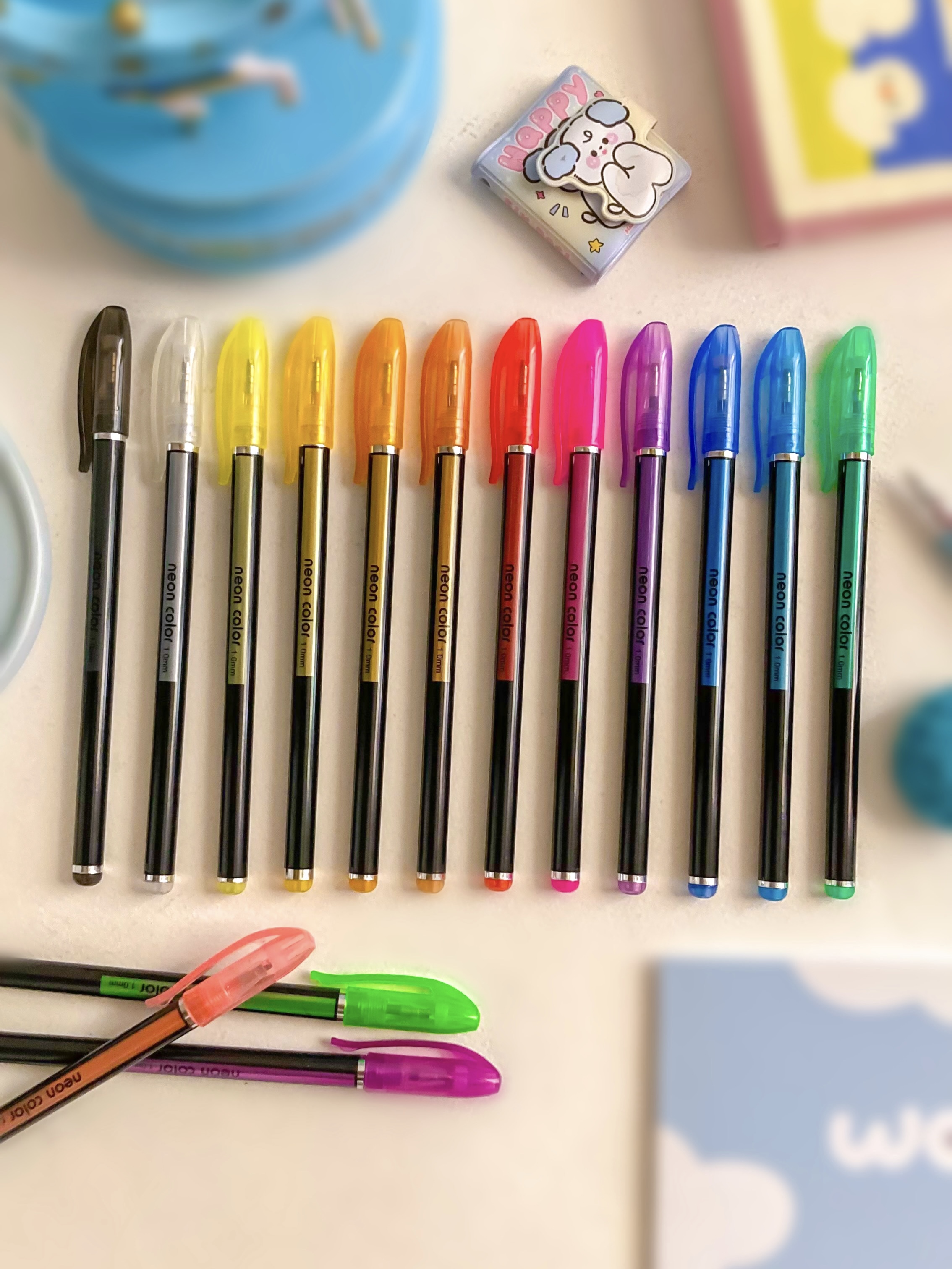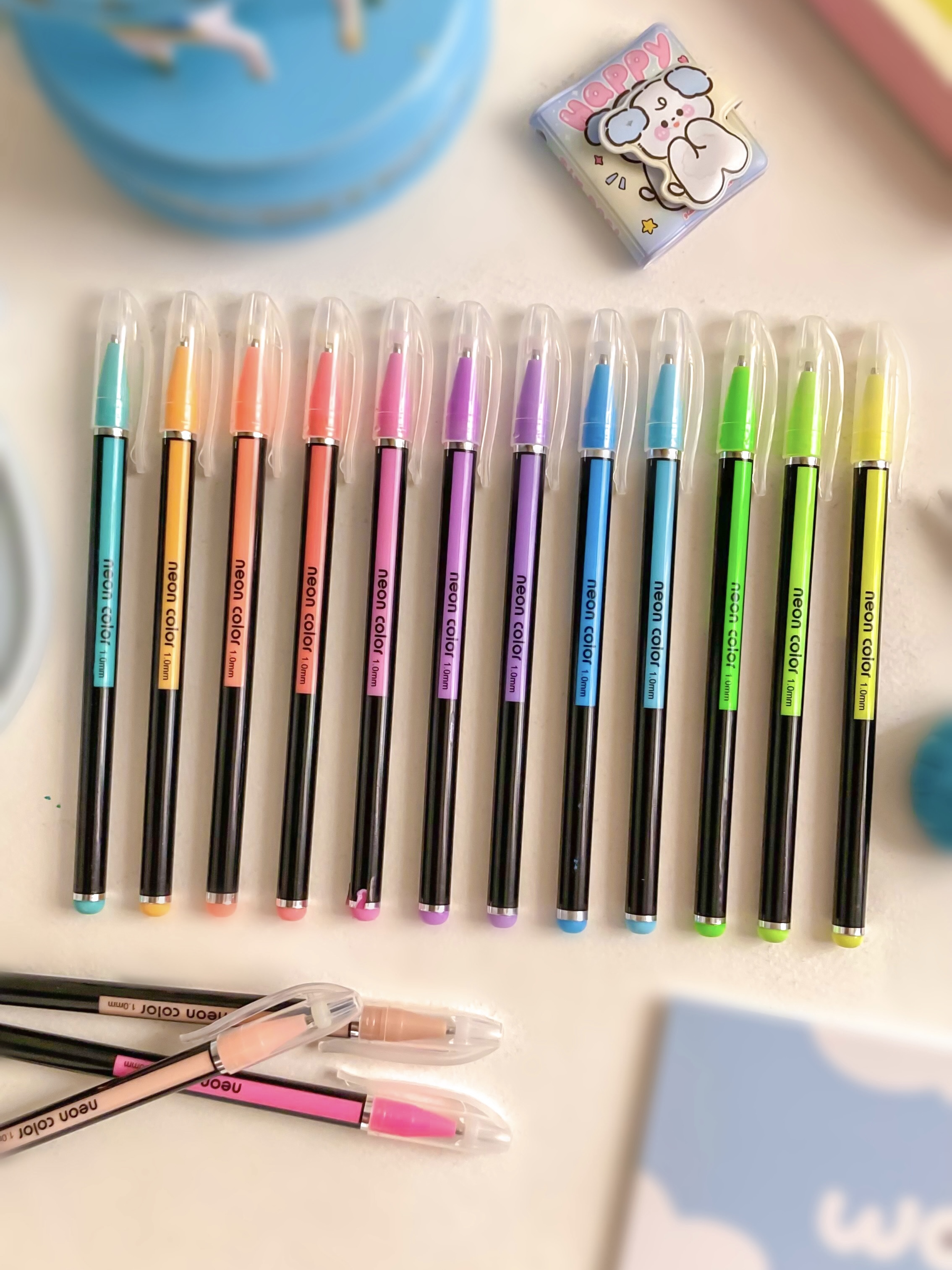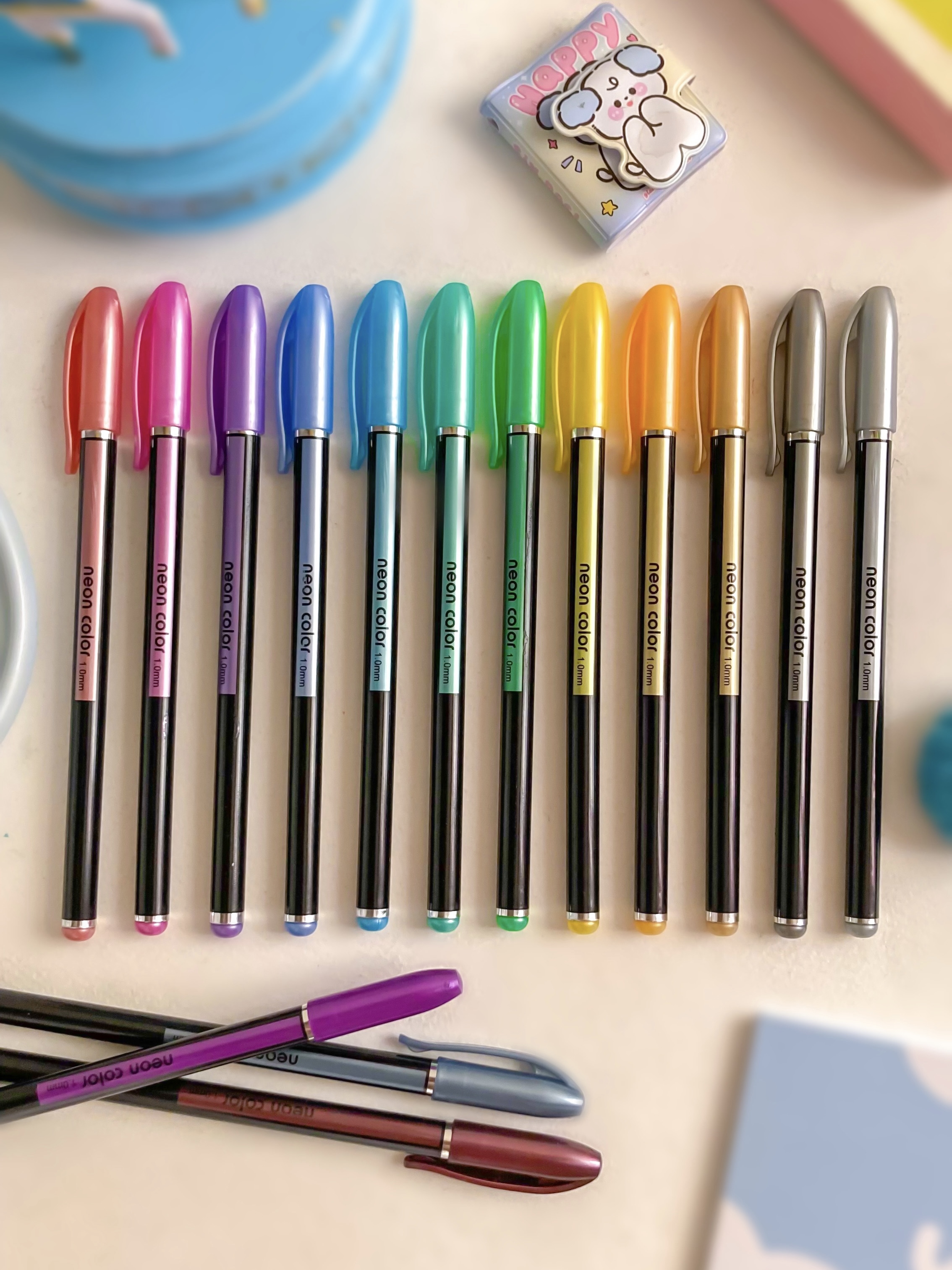 هرپک شامل ۱۵رنگ خودکار اکلیلی،۱۵رنگ خودکار پاستلی+۱۵رنگ خودکار متالیک و۱۵رنگ خودکار نئونی هست-ضخامت قلم: ۱میل-روی کاغذ مشکی هم میشه باهاش نوشت