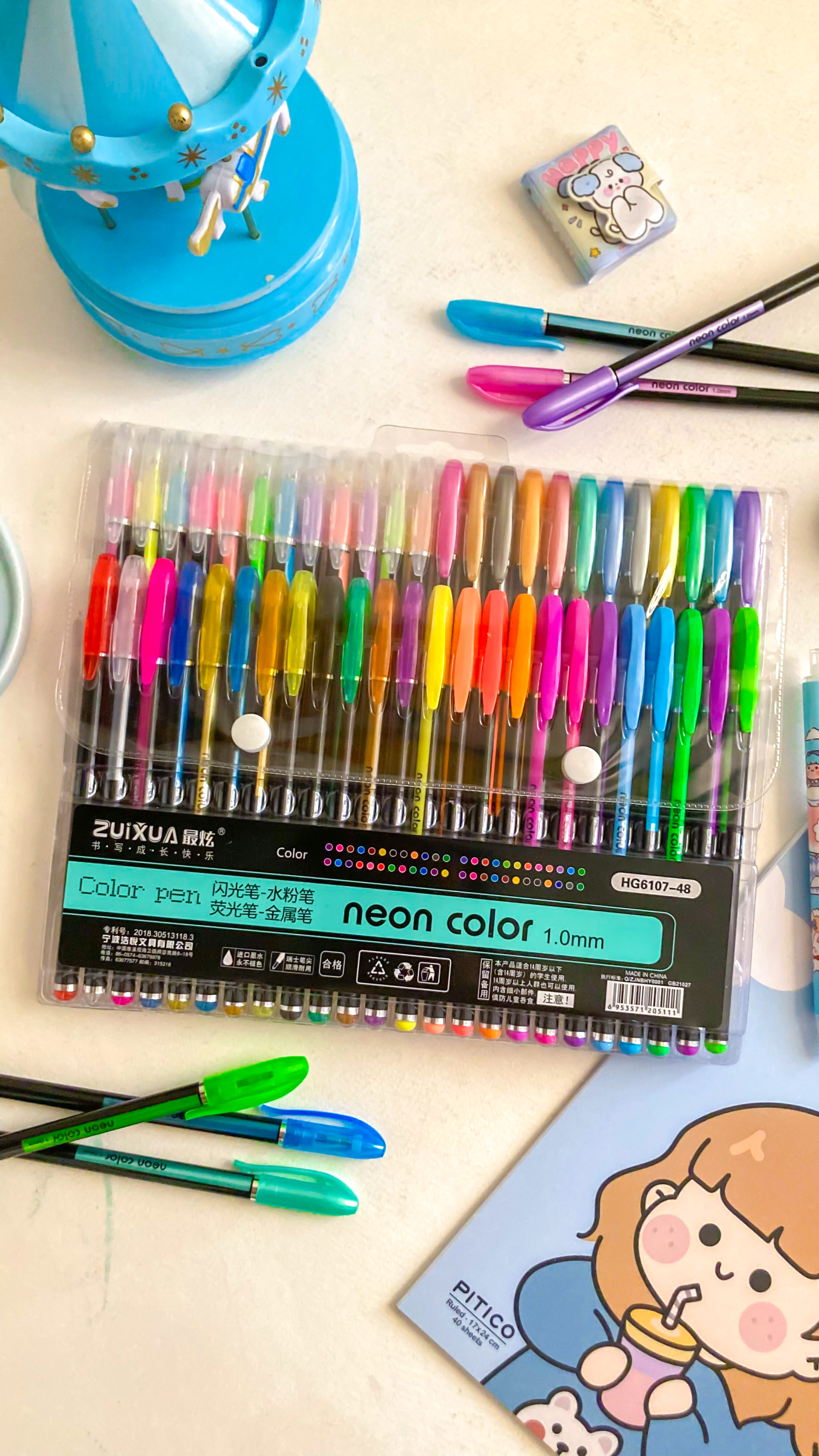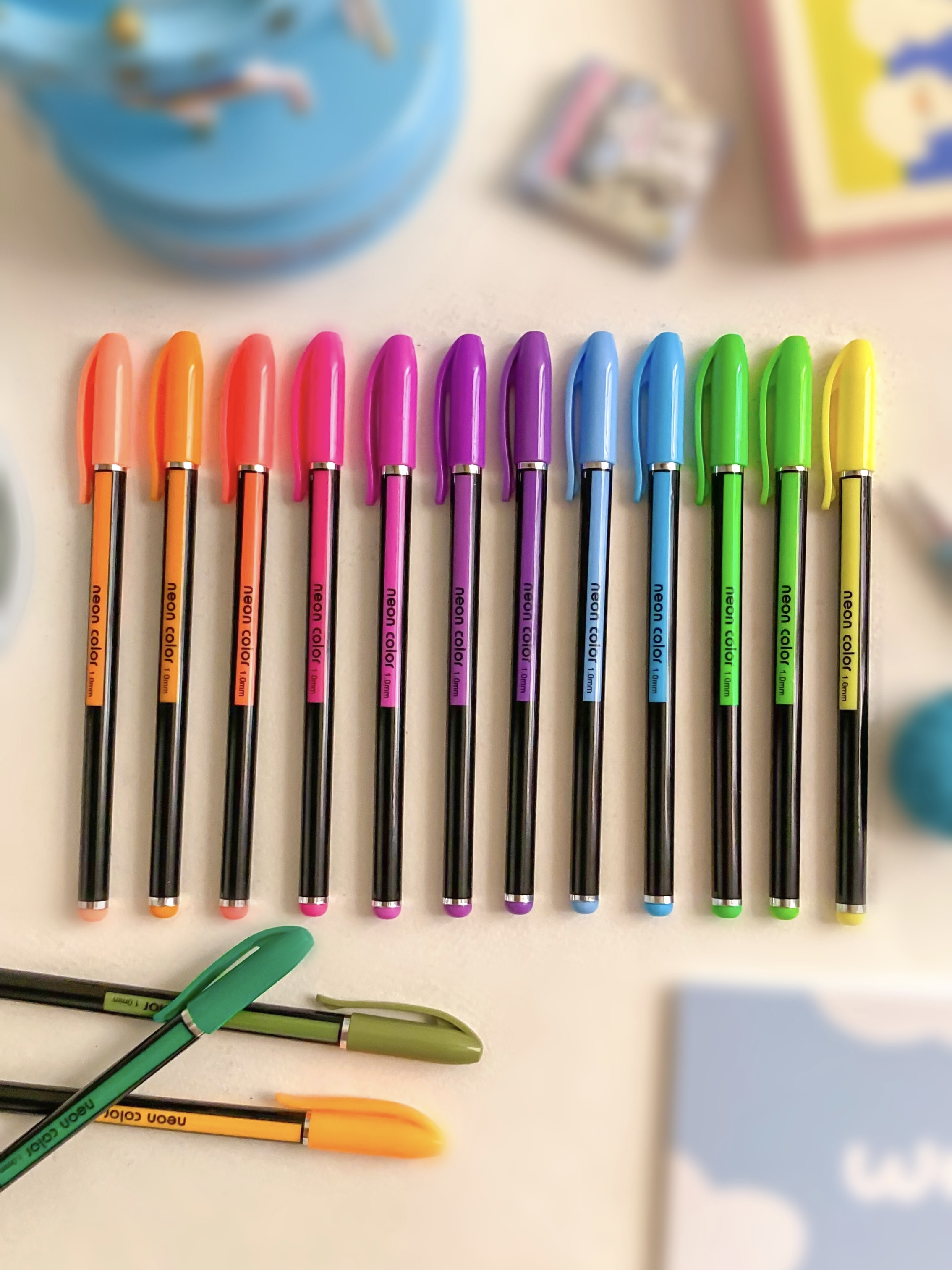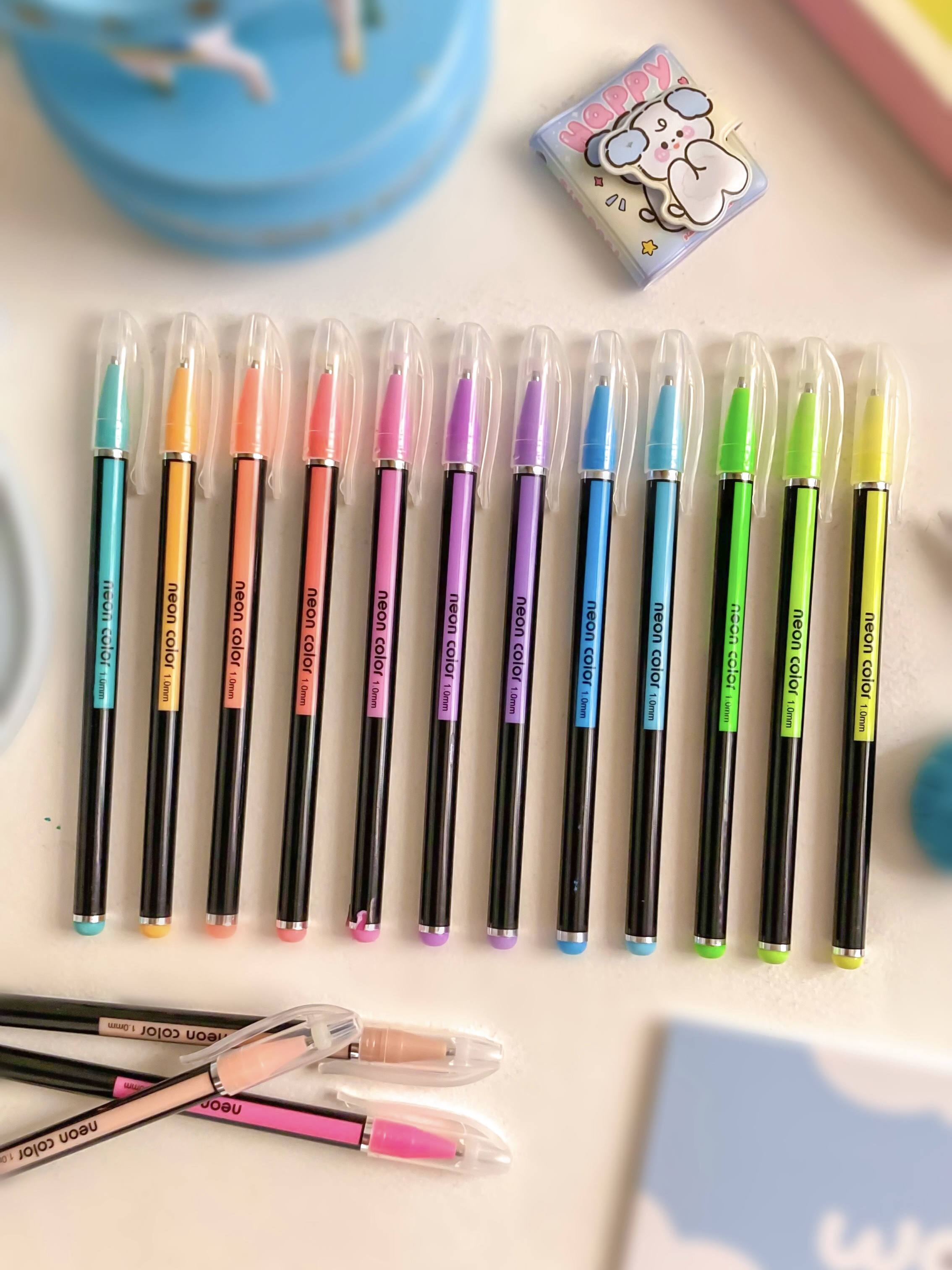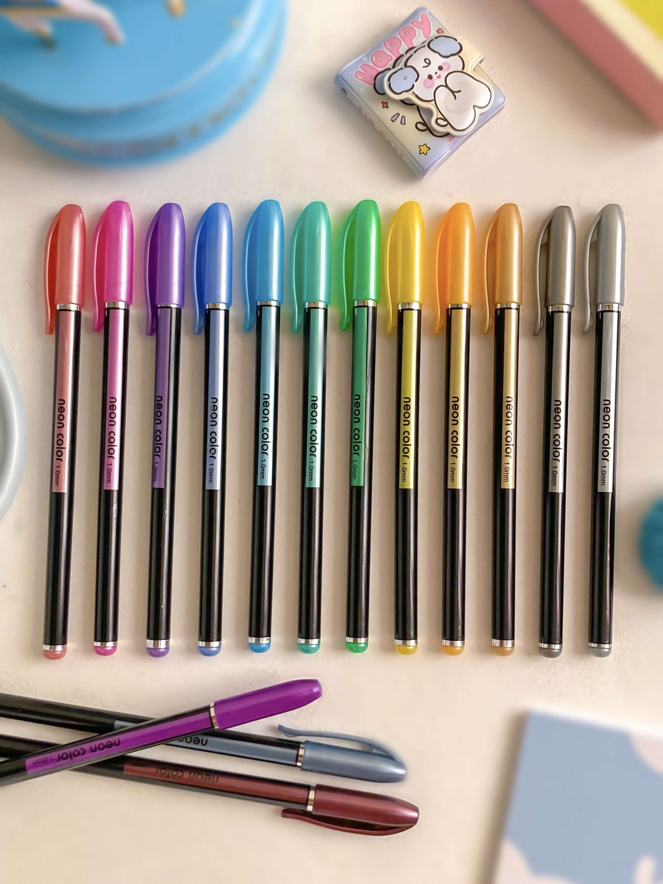 هرپک شامل ۱۲رنگ خودکار اکلیلی،۱۲رنگ خودکار پاستلی+۱۲رنگ خودکار متالیک و۱۲رنگ خودکار نئونی هست-ضخامت قلم: ۱میل-روی کاغذ مشکی هم میشه باهاش نوشت