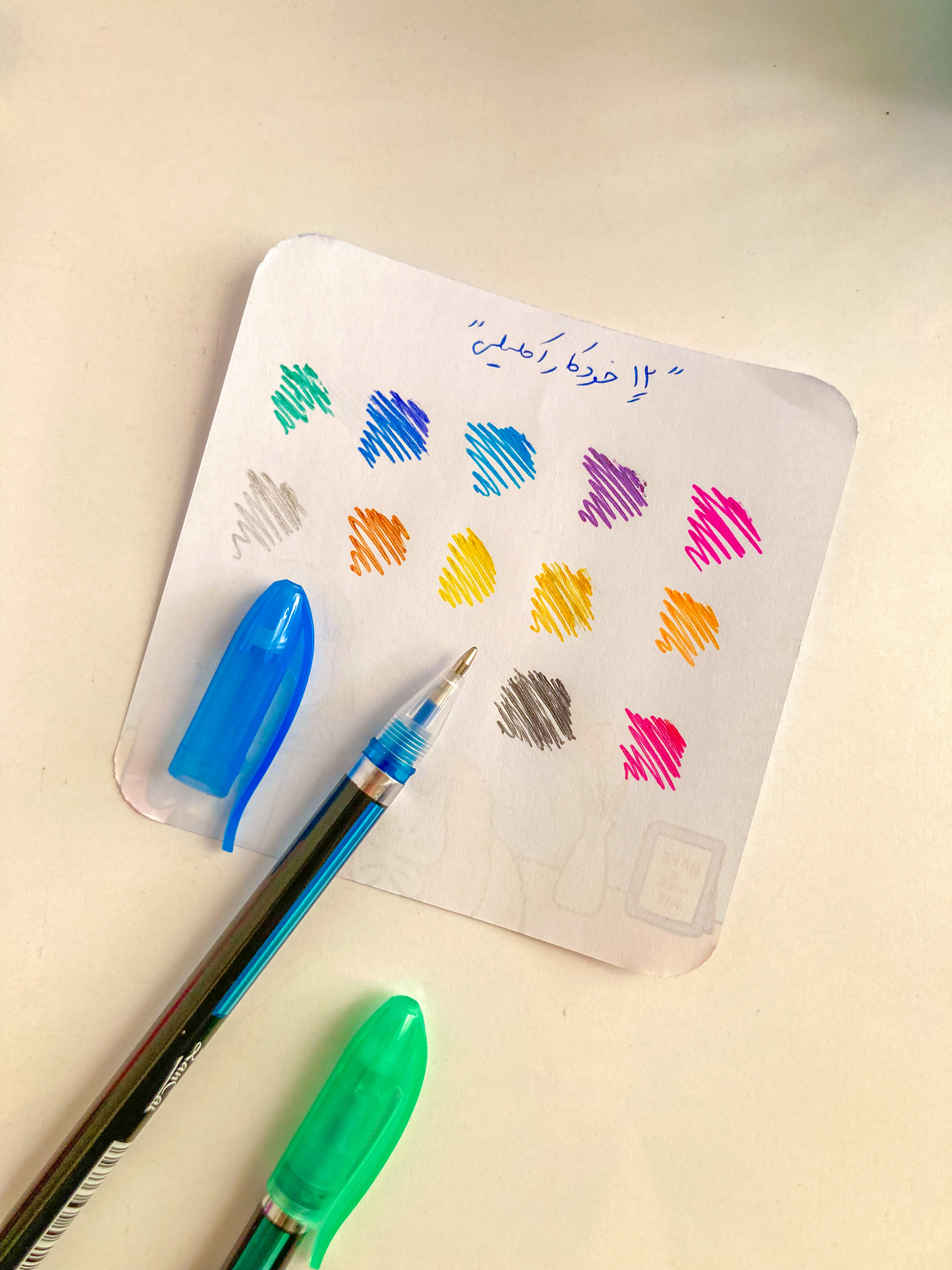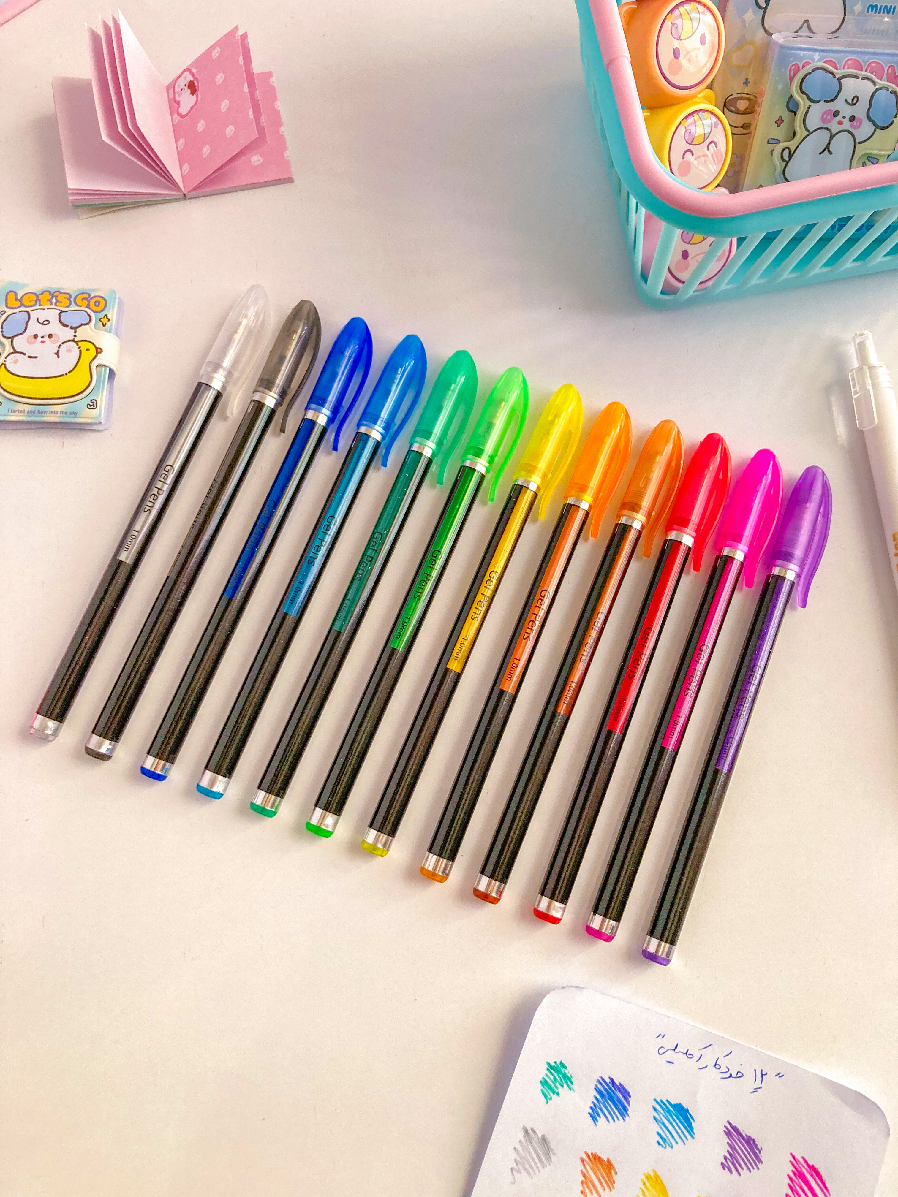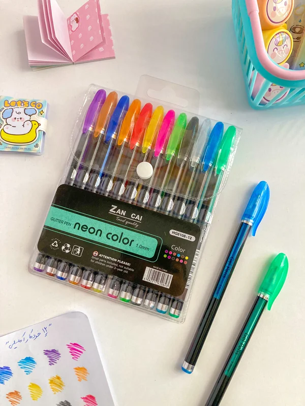 دارای دوازده رنگ اکلیلی که بعضی رنگا برای کاغذ مشکی هم قابل استفاده اس-ضخامت قلم:۰/۹- جوهر ژله ای ونسبتا روان