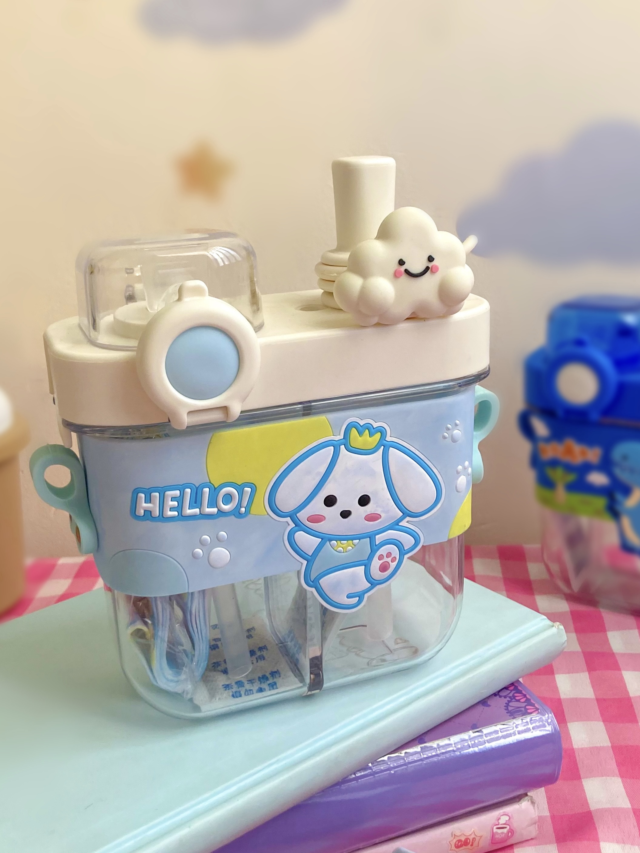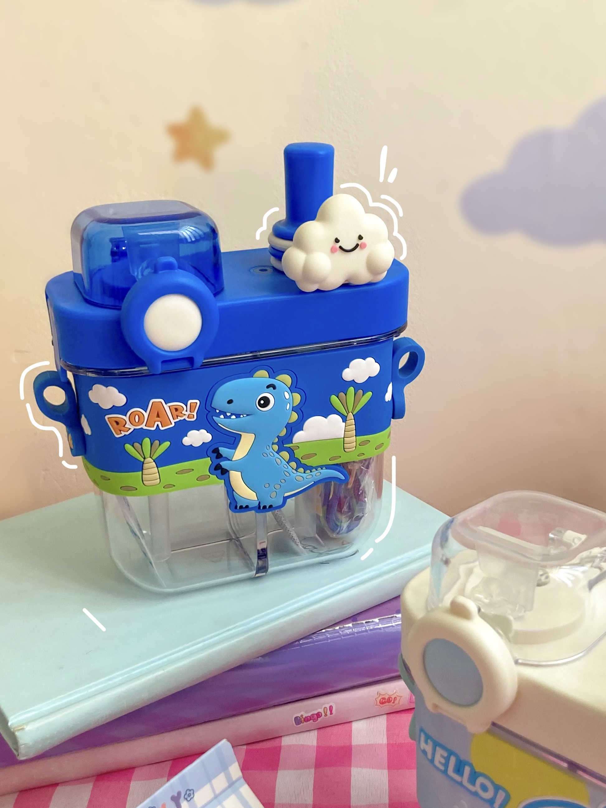 در دوطرح دایناسور و خرگوش- بدنه مقاوم و نشکن،با روکش سیلیکونی-بند دار،دارای درب آسان نوش و نی دار-ابعاد تقریبی قمقمه:۱۸در۱۵در۷سانتی متر