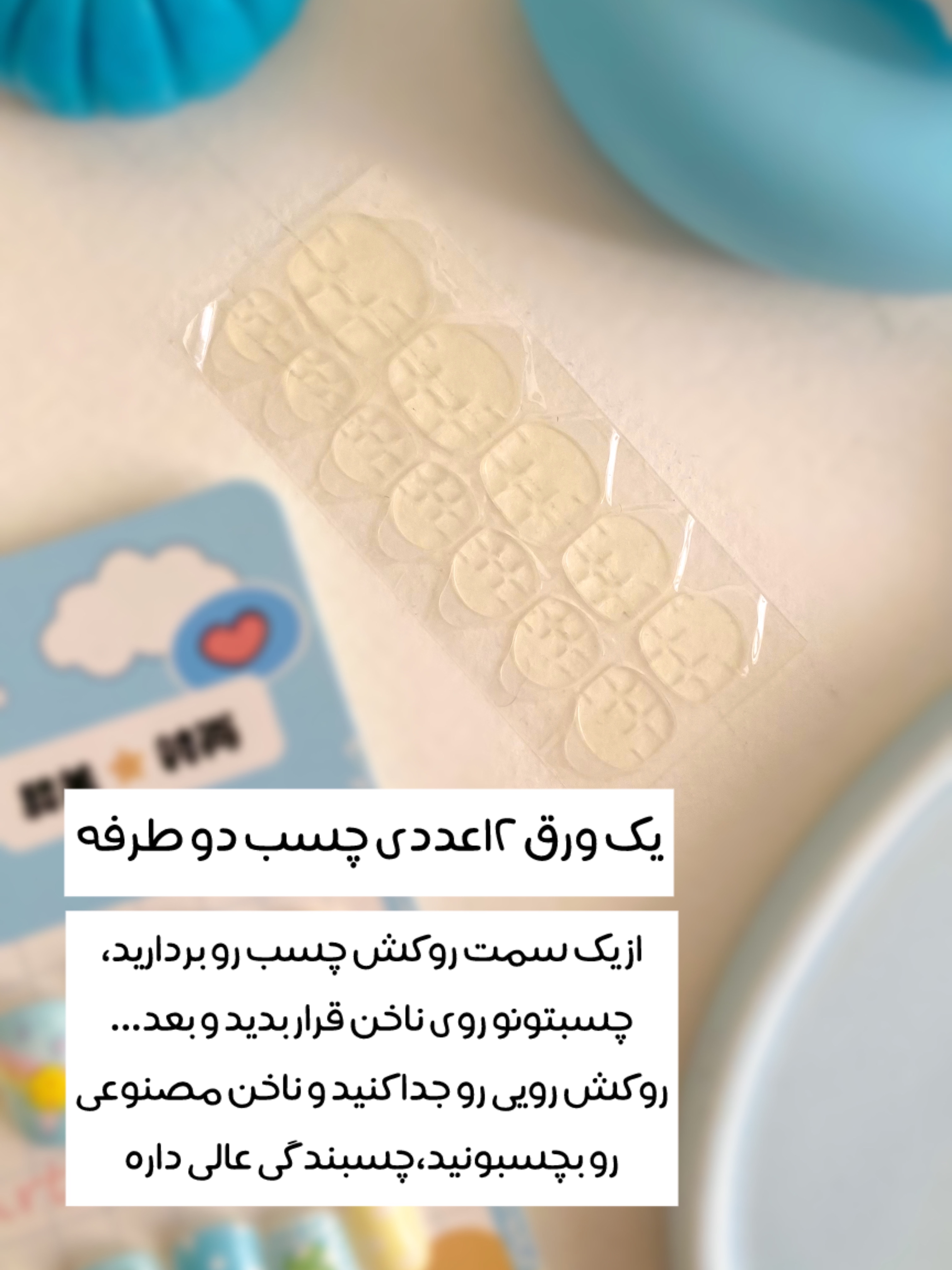 هر پک شامل ۱۲عدد ناخن+یک ورق ۱۲تایی چسب دوطرفه میشود-چسبندگی عالی تا چند ساعت-بدون کوچیکترین آسیب