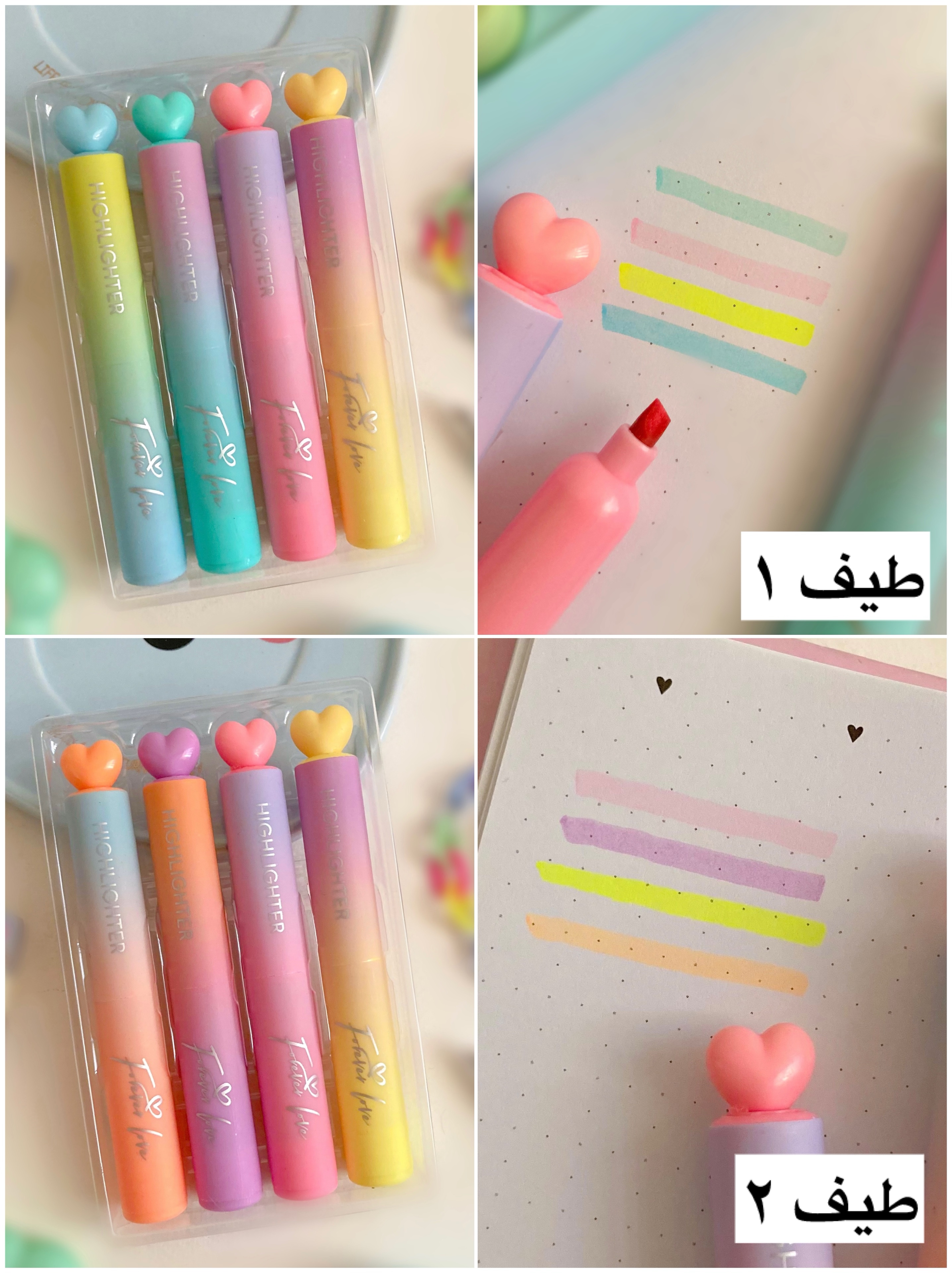 هرپک شامل ۴هایلایتر با رنگبندی مجزا و پاستلی هست که ارتفاعشون تقریبا۱۲سانتی متره-