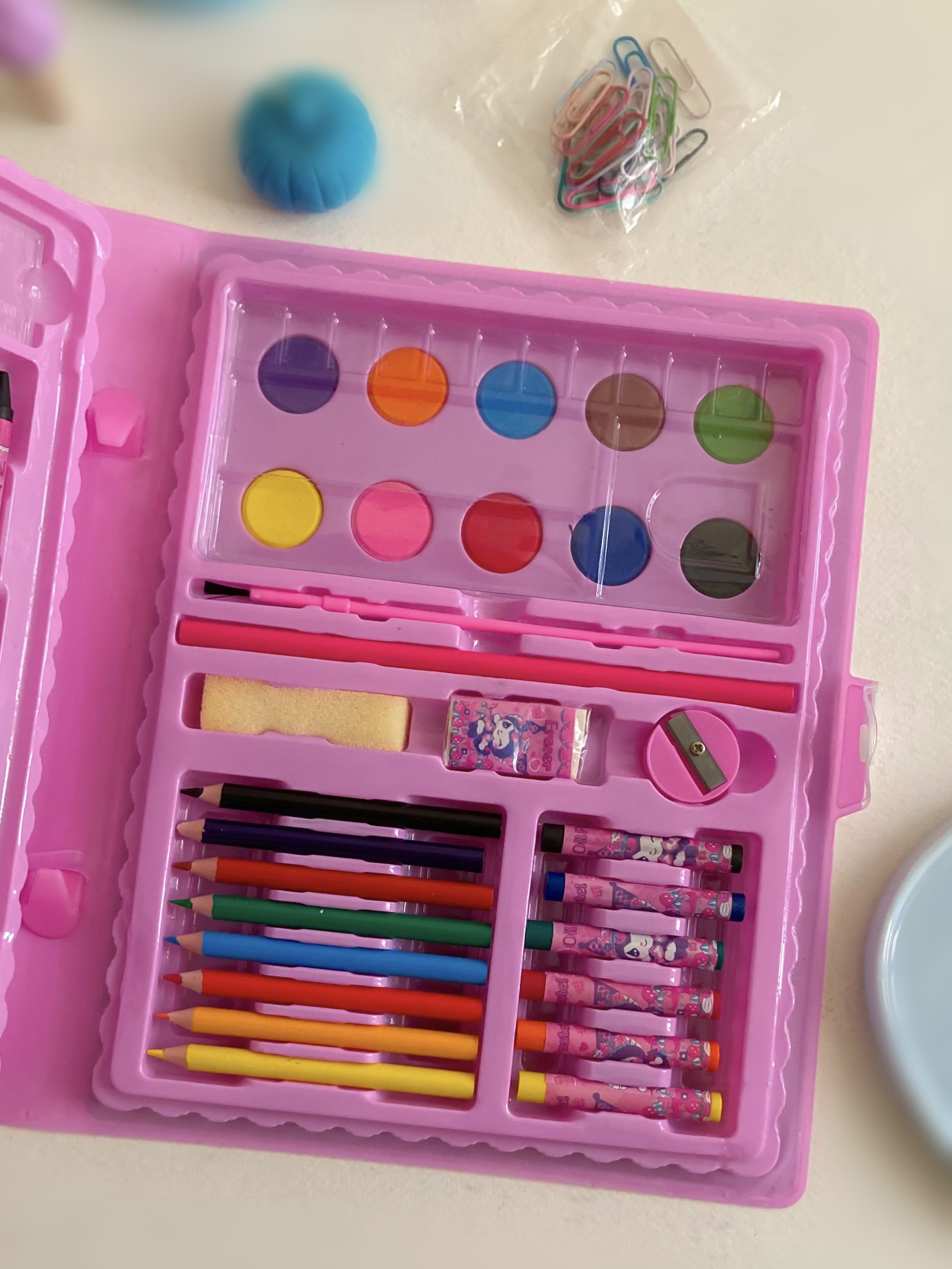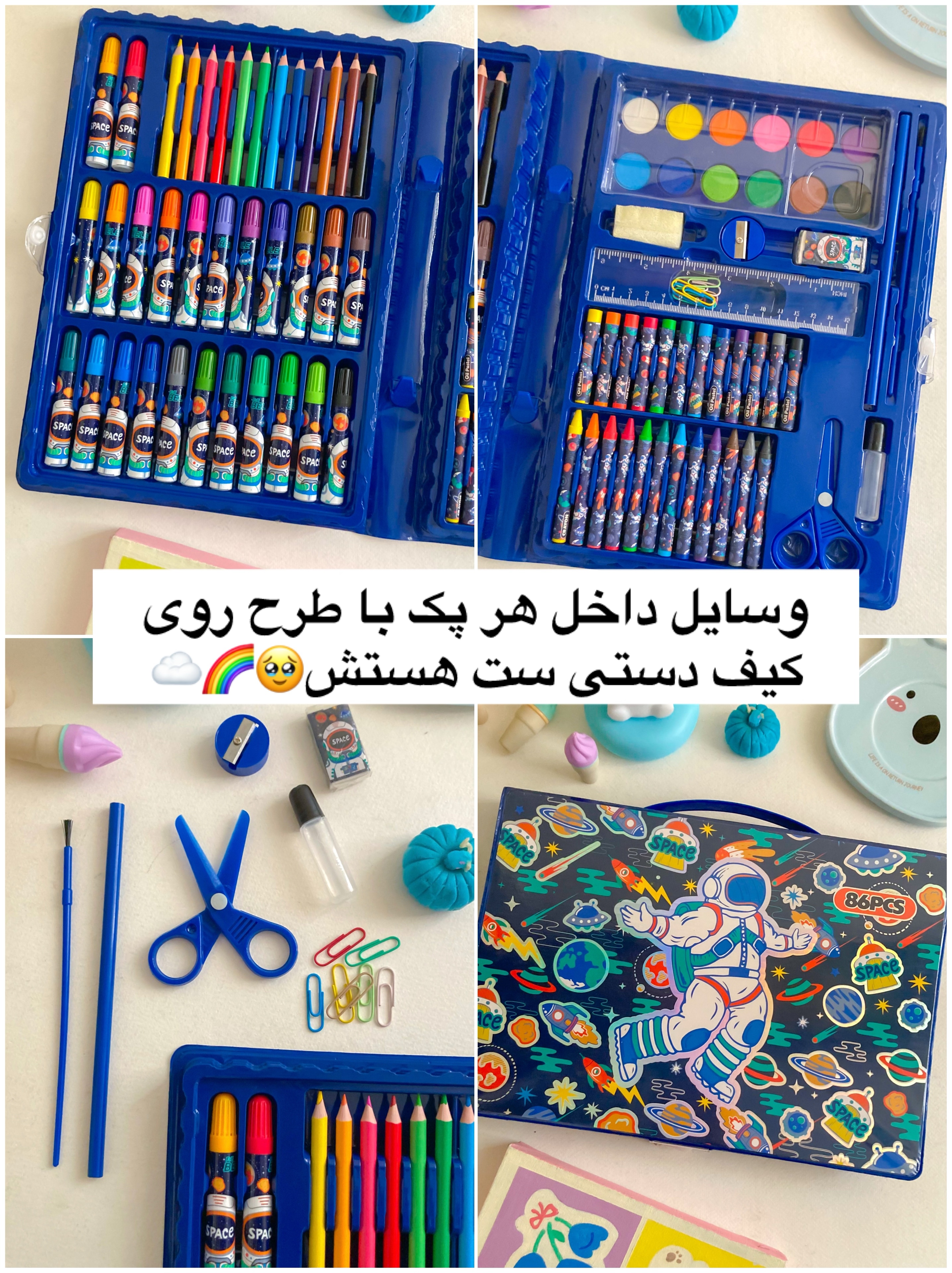 هرپک شامل ۸مدادرنگی+۸پاستل+تراش وپاکن+مدادسیاه+قلمو همراه با دوازده قرص آبرنگ+دوازده ماژیک رنگامیزی+دوازده مدادشمعی+خطکش ویک پک گیره کاغذی-کیفیت وسایل پک معمولیه