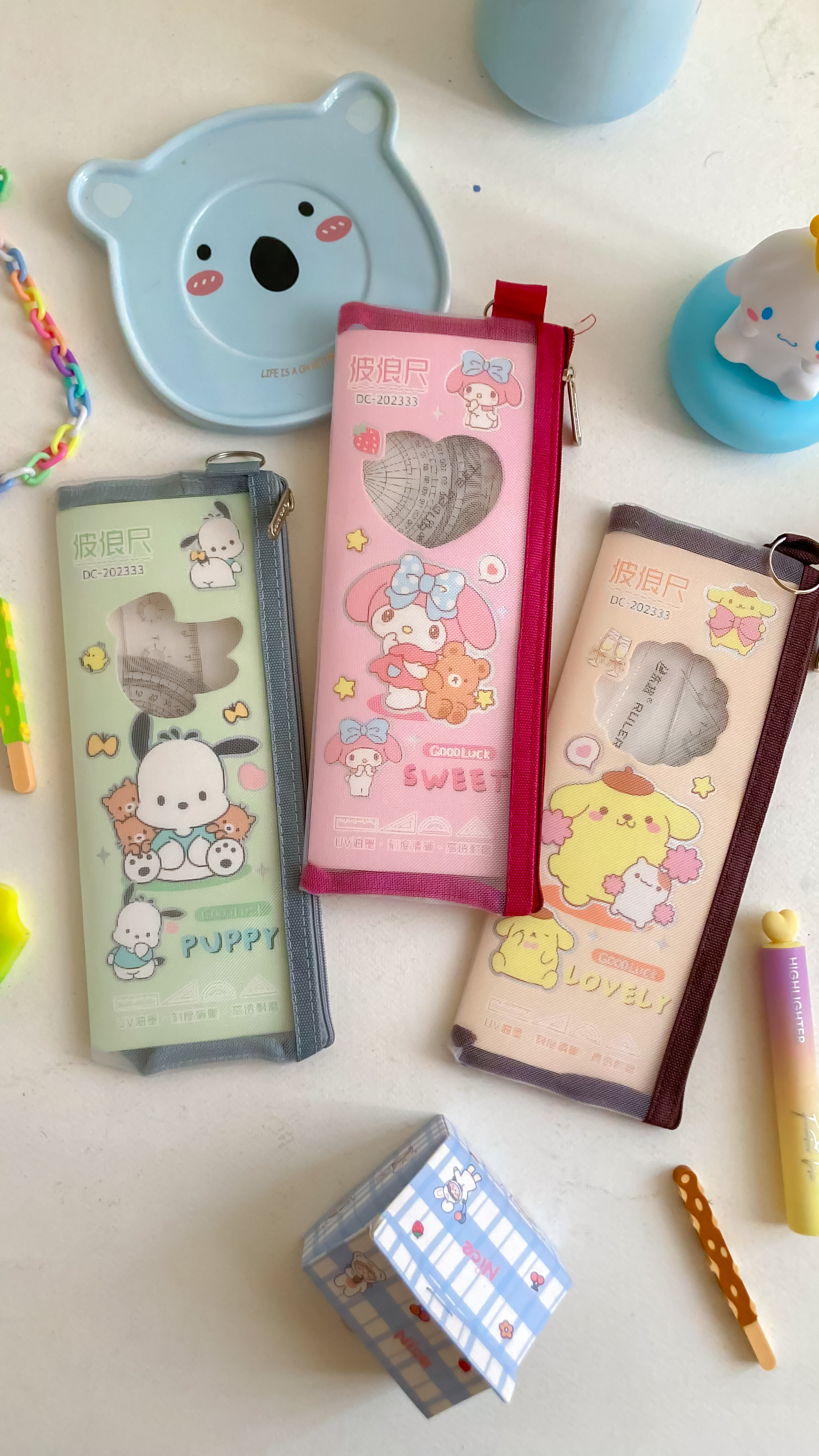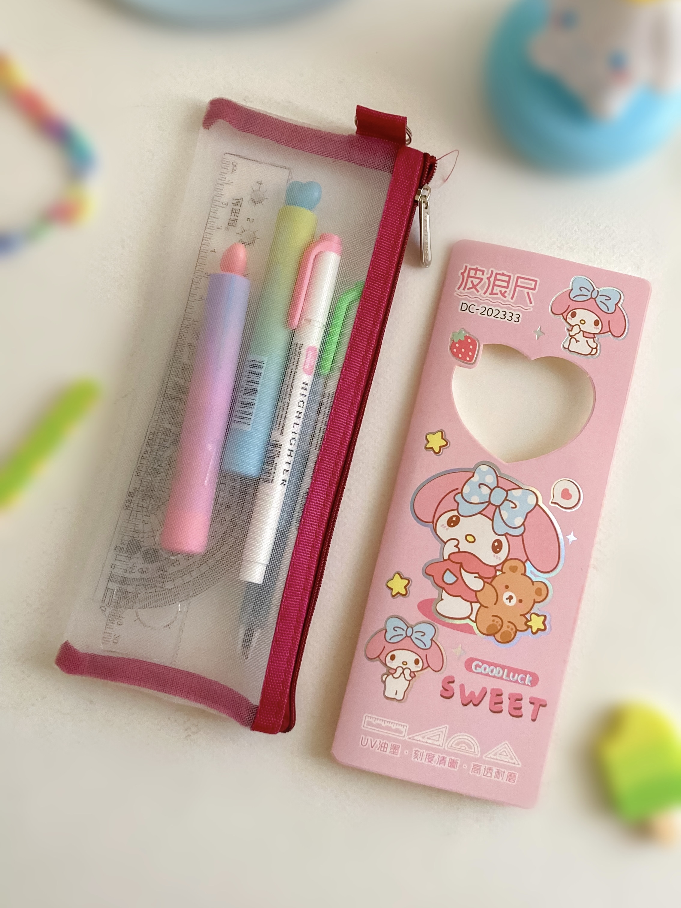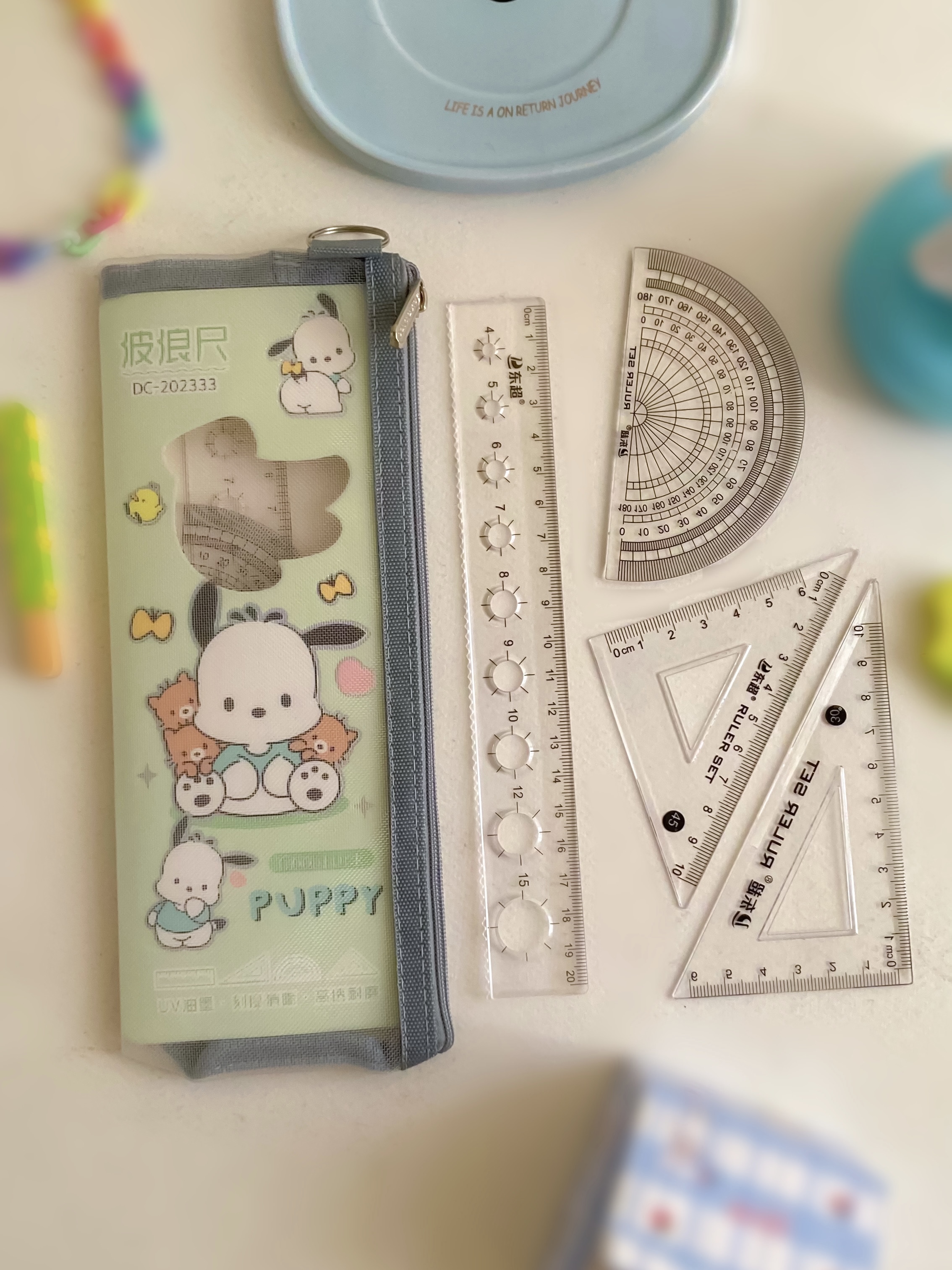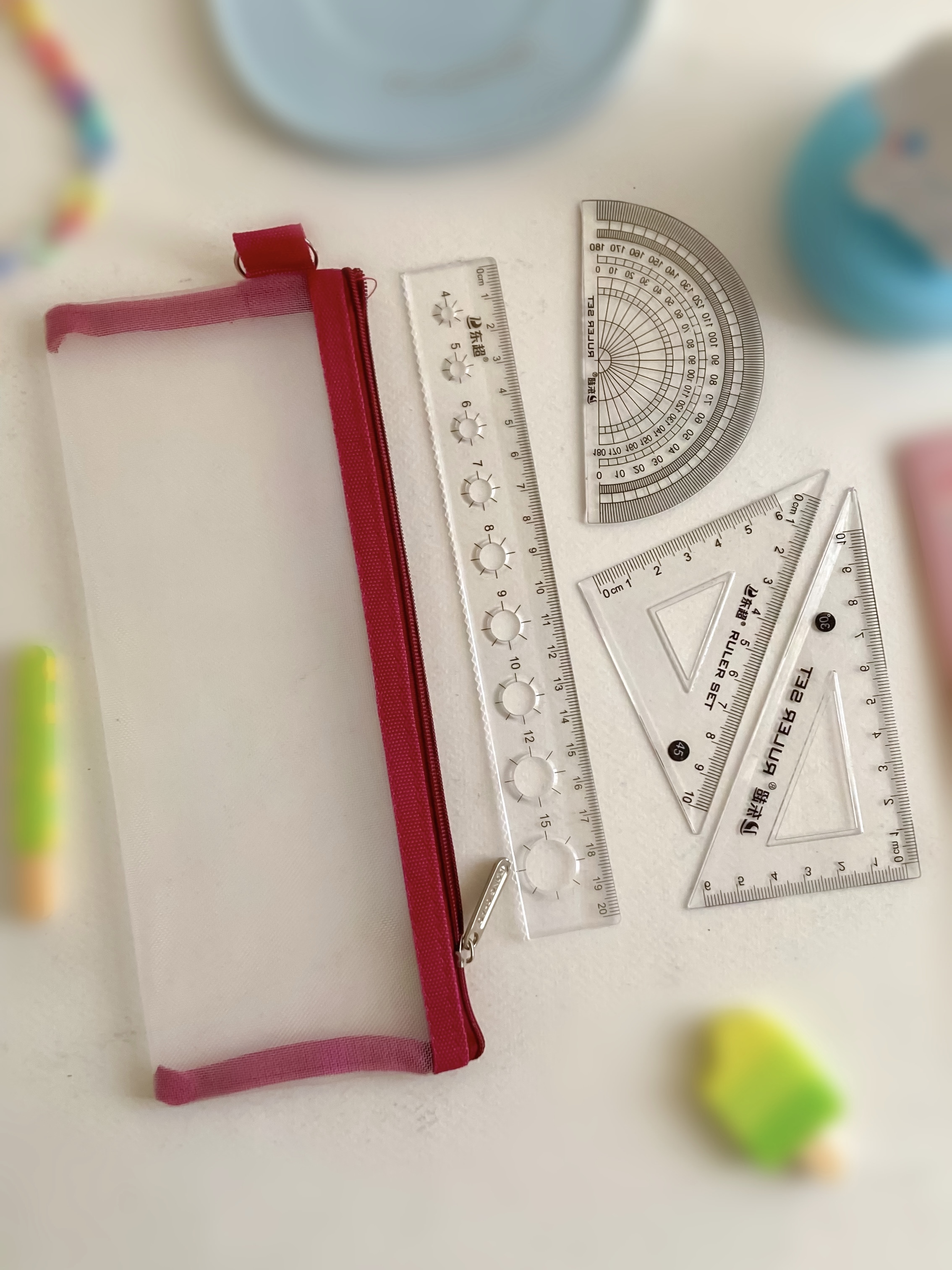 هرپک دارای خطکش شفاف و۲۰سانتی متری-گونیا۳۰ درجه و۴۵درجه-نقاله+یک جامدادی توری وشفاف(تور جامدادی کاملا مقاوم و ضخیمه)