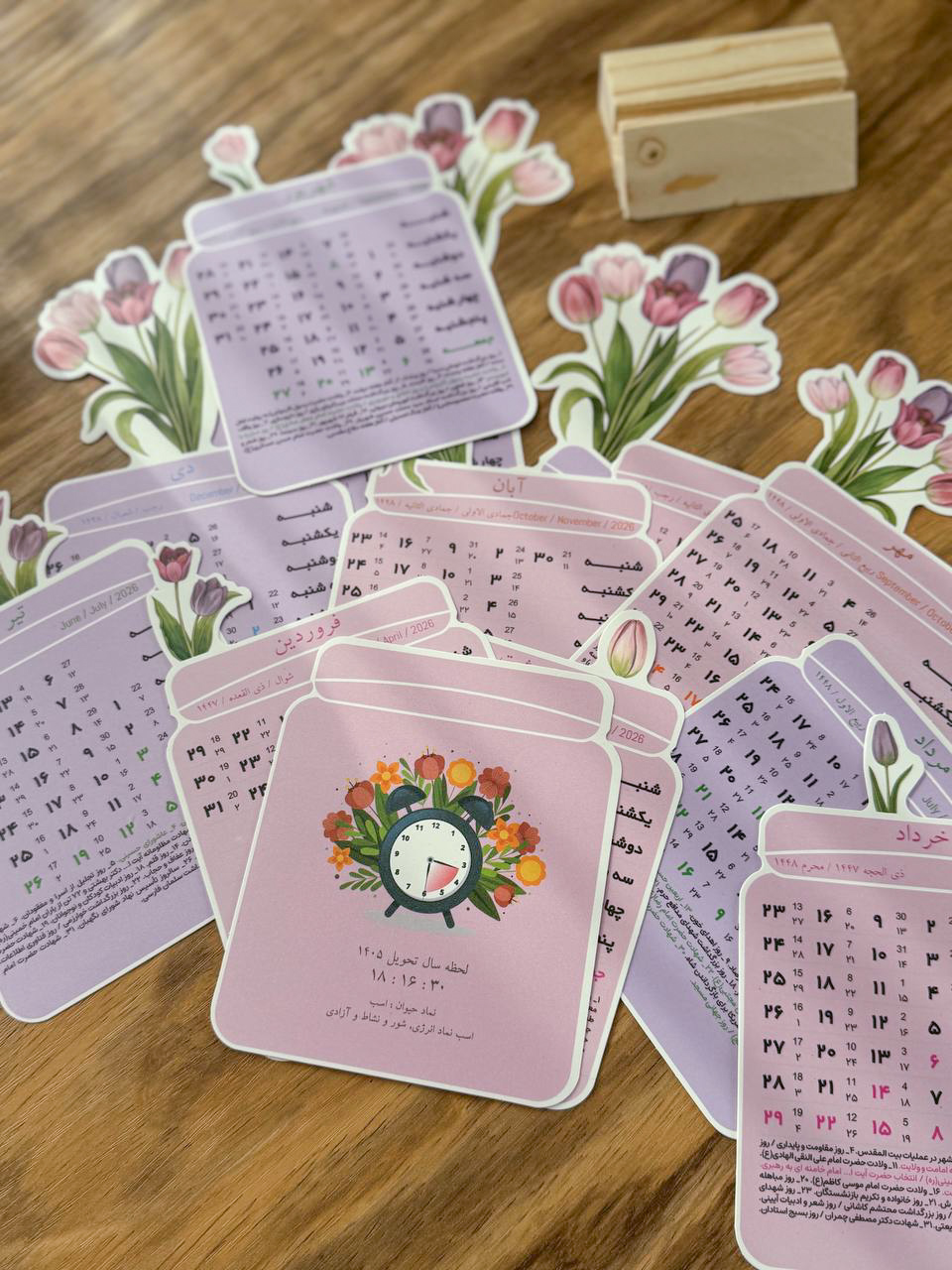 دارای پایه چوبی-دارای برگه های ضدآب و مقاوم از جنسPVC-ابعاد تقویم: ۲۱در۱۰/۵سانتی متر-رنگ برگه های هرفصل متغییر است-