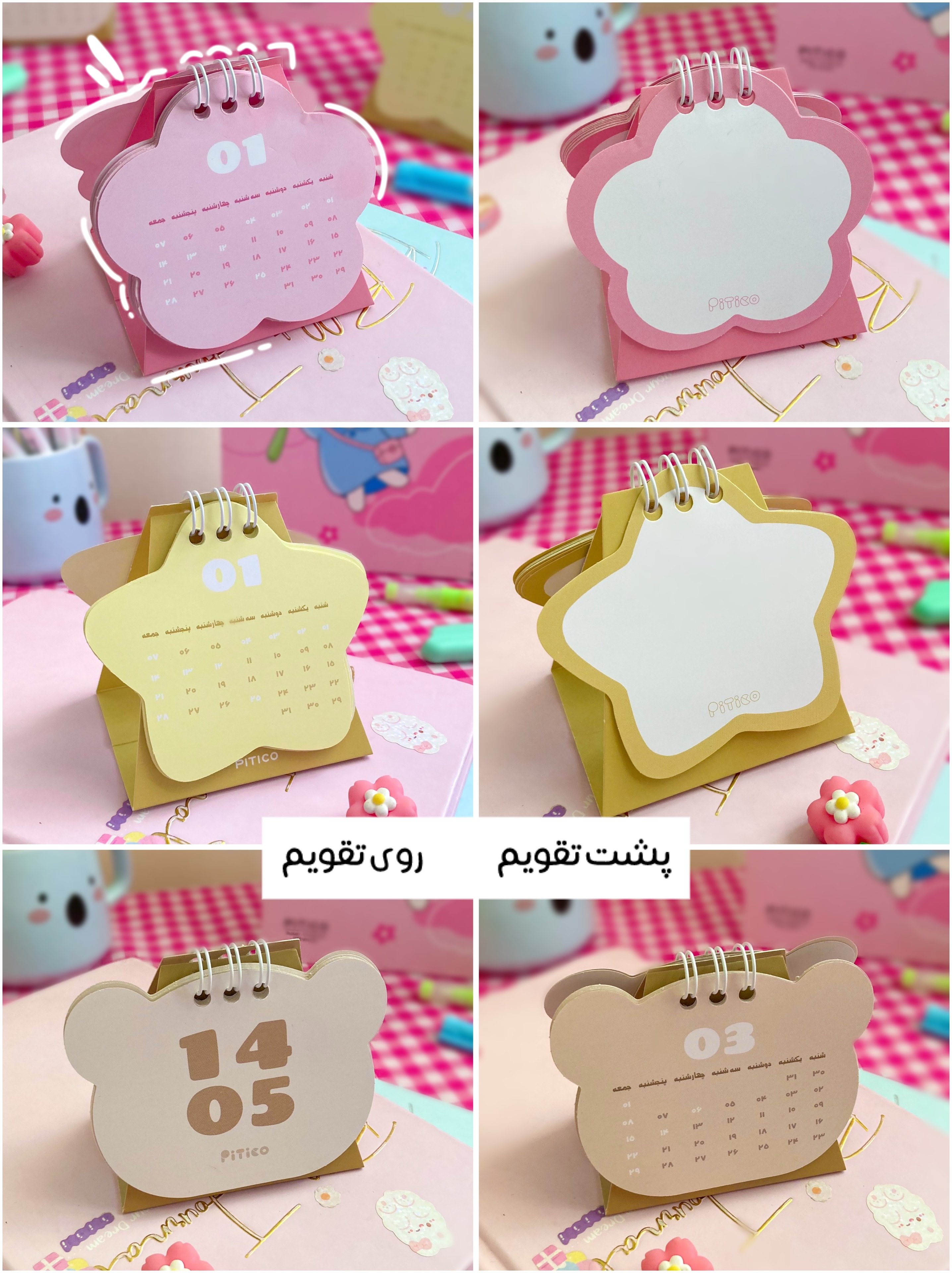 جنس تقویم: مقوای نرم-ابعاد کلی: ۸در۱۰ سانتی متر- مناسبت ها در تقویم قید نشده است.